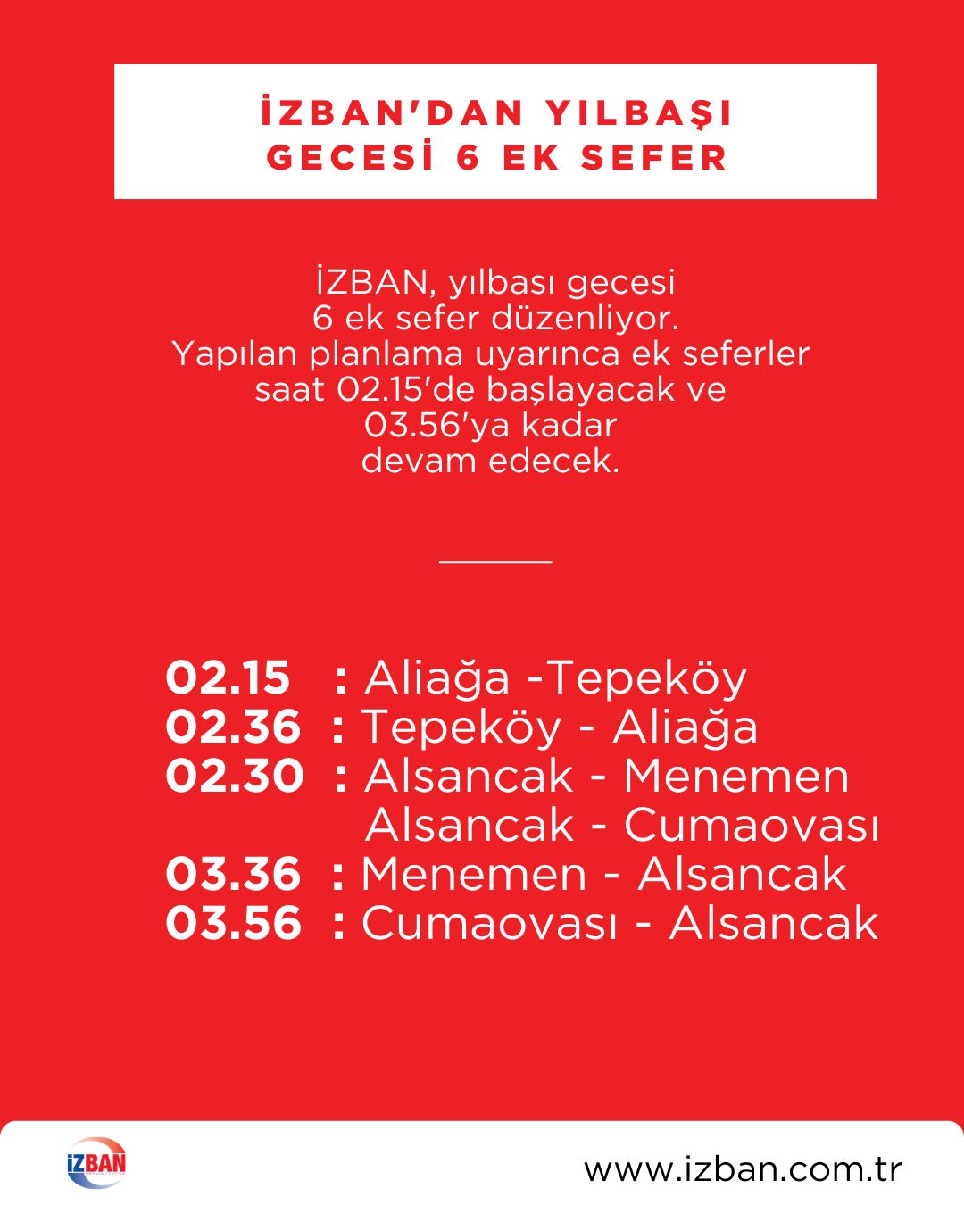 15.Mayıs.2011 tarihinden itibaren Aliağa - Menemen arasında ki seferlerimiz 30 dakikada bir olmak üzere düzenlenmiştir.